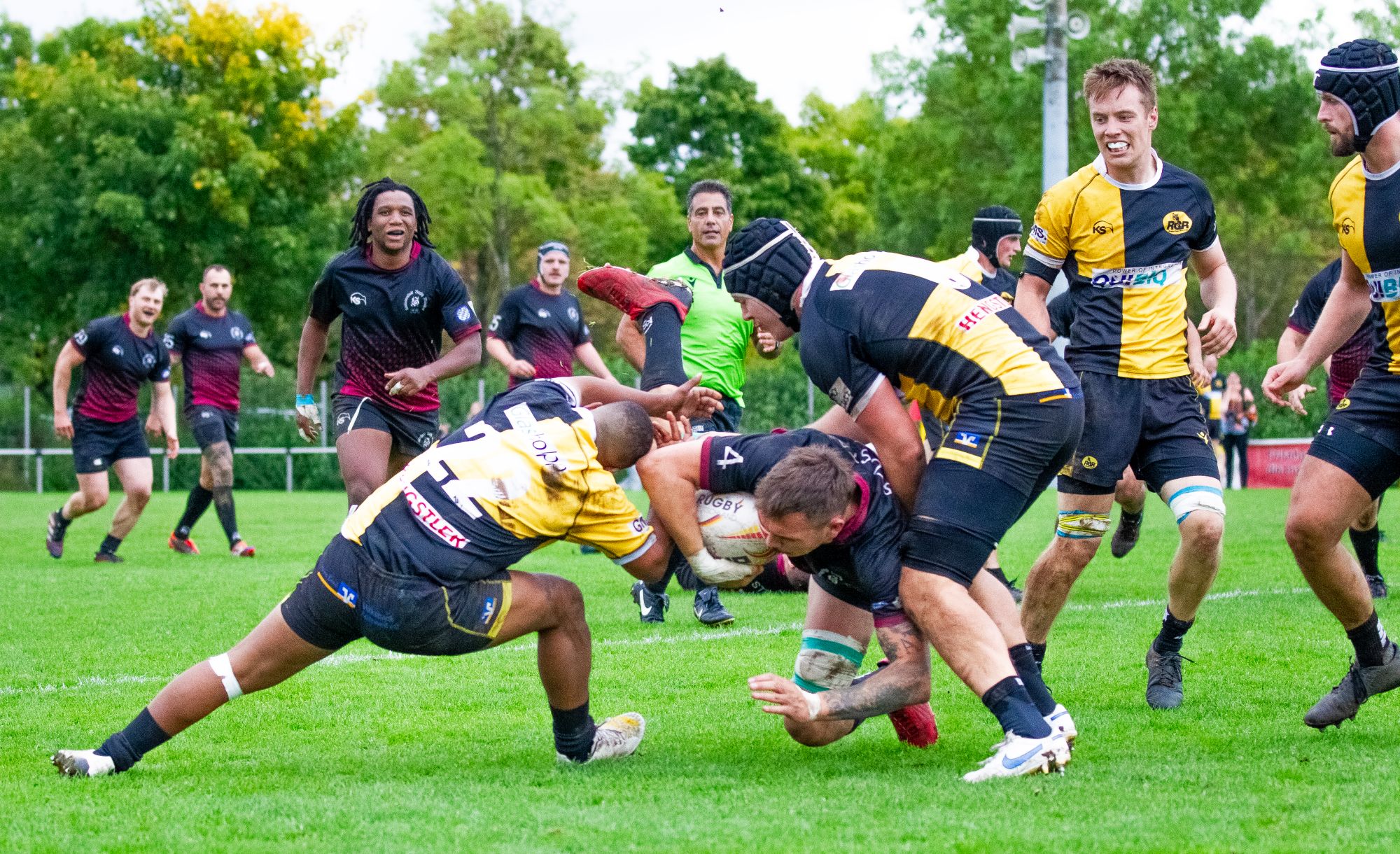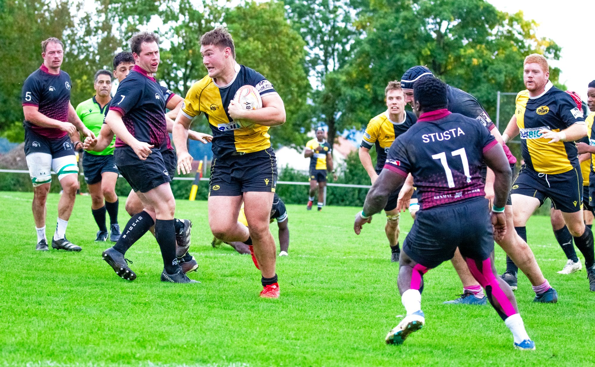 Zum verkürzten Spielverlauf: Die körperlich ausgeglichenen Teams tasteten sich vor 200 Zuschauern nur die ersten paar Minuten ab. Die „Schwarz-Gelbe“-Überlegenheit zeichnete sich schnell ab. Die Hessen wurden in die Verteidigung gedrängt und kamen kaum in Ballbesitz. Mit zwei Versuchen in der ersten Halbzeit zeigte sich die Überlegenheit der Gastgeber. So waren es die Drei-Viertel Spieler Valentino Vlees und Tyler van Vollenhoven, die erfolgreich ablegen konnten. Gedrängehalb Robert Carr erhöhte auf 12:0. Mehrere zugesprochene Gedränge aber nutzten die RKH‘ler bei ihrem ersten druckvollen Angriff zum 12:7-Halbzeitstand.